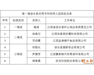 根据《修水县优秀专利发明人奖励办法》有关规定,第一届修水县优秀专利发明人奖共评选出一等奖1项、二等奖2项、三等奖3项,现予...
