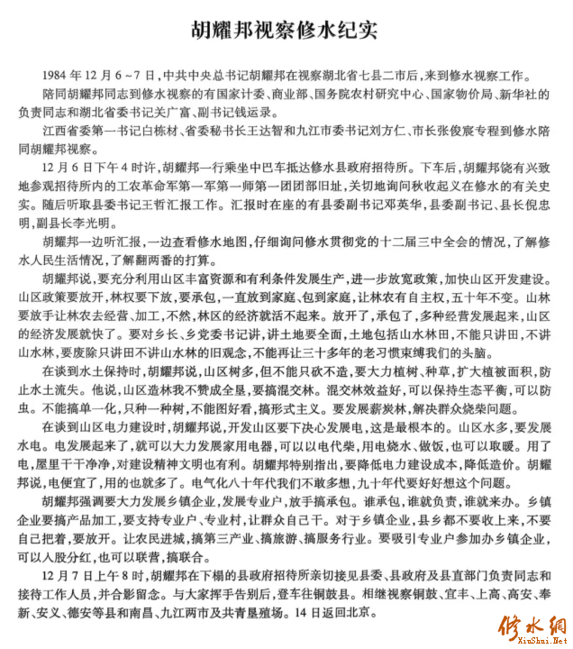 1984年12月6~7日,中共中央总书记胡耀邦在视察湖北省七县二市后,来到修水视察工作。 陪同胡耀邦同志到修水视察的有国家计委、商业部、国务院农村研究中心、国家物价局、新华社的负责同志和湖北省委书记关广富、副书记钱运录。 江西省委第一书记白栋材、省委秘书长王达智和九江市委书记刘方仁、市长张俊宸专程到修水陪同胡耀邦视察。 12月6日下午4时许,胡耀邦一行乘坐中巴车抵达修水县政府招待所。下车后,胡耀邦饶有兴致地参观招待所内的工农革命军第一军第一师第一团团部旧址,关切地询问秋收起义在修水的有关史实。随后听取县委书记王哲汇报工作。汇报时在座的有县委副书记邓英华,县委副书记、县长倪忠明,副县长李光明。 胡耀邦一边听汇报,一边查看修水地图,仔细询问修水贯彻党的十二届三中全会的情况,了解修水人民生活情况,了解翻两番的打算。 胡耀邦说,要充分利用山区丰富资源和有利条件发展生产,进一步放宽政策,加快山区开发建设。山区政策要放开,林权要下放,要承包,一直放到家庭、包到家庭,让林农有自主权,五十年不变。山林要放手让林农去经营、加工,不然,林区的经济就活不起来。放开了,承包了,多种经营发展起来,山区的经济发展就快了。要对乡长、乡党委书记讲,讲土地要全面,土地包括山水林田,不能只讲田,不讲山水林,要废除只讲田不讲山水林的旧观念,不能再让三十多年的老习惯束缚我们的头脑。 修水网 www.xiushui.Net 在谈到水土保持时,胡耀邦说,山区树多,但不能只砍不造,要大力植树、种草,扩大植被面积,防止水土流失。他说,山区造林我不赞成全垦,要搞混交林。混交林效益好,可以保持生态平衡,可以防虫。不能搞单一化,只种一种树,不能图好看,搞形式主义。要发展薪炭林,解决群众烧柴问题。 在谈到山区电力建设时,胡耀邦说,开发山区要下决心发展电,这是最根本的。山区水多,要发展水电。电发展起来了,就可以大力发展家用电器,可以以电代柴,用电烧水、做饭,也可以取暖。用了电,屋里干干净净,对建设精神文明也有利。胡耀邦特别指出,要降低电力建设成本,降低造价。胡耀邦说,电便宜了,用的也就多了。电气化八十年代我们不敢多想,九十年代要好好想这个问题。 胡耀邦强调要大力发展乡镇企业,发展专业户,放手搞承包。谁承包,谁就负责,谁就来办。乡镇企业要搞产品加工,要支持专业户、专业村,让群众自己干。对于乡镇企业,县乡都不要收上来,不要自己把着,要放开。让农民进城,搞第三产业、搞旅游、搞服务行业。要吸引专业户参加办乡镇企业,可以人股分红,也可以联营,搞联合。 12月7日上午8时,胡耀邦在下榻的县政府招待所亲切接见县委、县政府及县直部门负责同志和接待工作人员,并合影留念。与大家挥手告别后,登车往铜鼓县。相继视察铜鼓、宜丰、上高、高安、奉新、安义、德安等县和南昌、九江两市及共青垦殖场。14日返回北京。 ![]() 来源:新华社、《修水县志(1986~2008)》 |