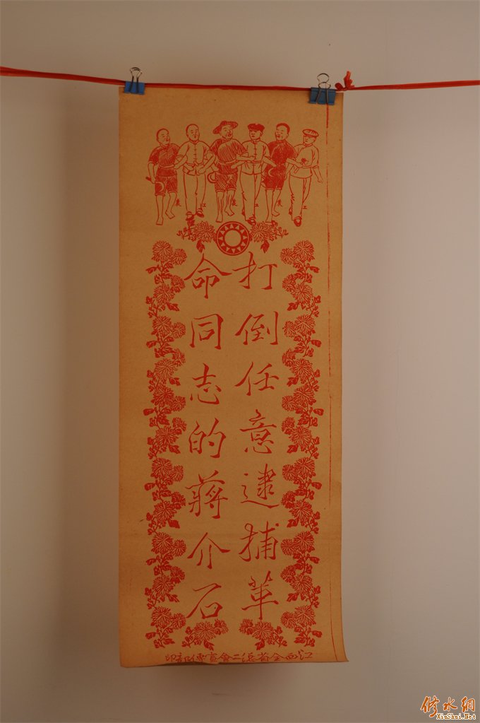 ![]() 1927年江西全省总工会宣传部印发的“打倒任意逮捕革命同志的蒋介石”标语(00210) |