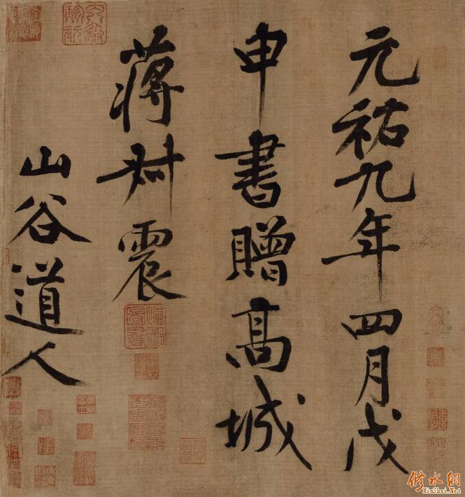 是卷著录累累,曾为(明)郁逢庆、(明)汪砢玉、(清)卞永誉、(清)倪涛、(清)孙岳颁、(清)吴其贞等明清书画鉴赏大家明确著录,纪昀《四库全书》亦有载。民国时期如王云五、丁福保、张钧衡等亦有记录。而宋濂、祝允明、徐霖等人艺术年表中也有清晰记载,《顾文彬日记》中,将此卷原为董麟寄存“德宝斋”,《徐世昌日记》中又言经德宝斋入藏的始末清晰记录,其来源之清晰有序,足见也。 修水网 而卷中精美的装帧,逾百枚之多的鉴藏印,无不彰显着其为历代藏家所珍。祝允明更谓之“真所谓神品矣”。黄庭坚名列“宋四家”,其书法墨迹流传罕见,价值亦极昂。 黄庭坚的《诸上座帖》,大字草书,六百余字,是张伯驹不惜债台高筑,以十座四合院换购;大字行书《砥柱铭》曾在2010年北京春拍,价达4.368亿元,单字约70万,可谓天价。而本卷《释典卷》大字草书,字千字余,书艺精妙绝伦,观者谓之神品,著录、题跋、钤印累累,又为绢本,项元汴称为“山谷唯一的绢本真迹巨卷”,此次现身日本上氏拍卖,亦应可谓是极难得之墨缘,笔者有缘率先寓目,幸也。 ![]()