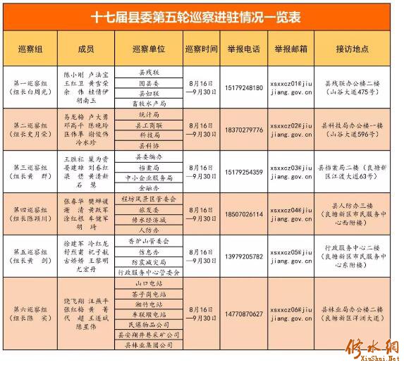 根据县委统一部署,十七届县委第五轮巡察工作全面启动,8月13日上午召开了县委巡察工作动员大会。今天,县委6个巡察组已经全部进驻到位,开始对县委编办、县工商联、团县委、县妇联、统计局、县残联、科技局、县科协、畜牧水产局、档案局、中小企业服务局、人防办、程坊风景区管委会、旅发委、修水经济城、香炉山管委会、信息办、防震减灾局、行政服务中心管委会、金融办等20个县直部门,山口电站、茶子岗电站、湘竹电站、车联堰电站、民爆物品有限公司、安翔井巷采矿有限公司、县林业集团公司等7个县管国企的常规巡察。