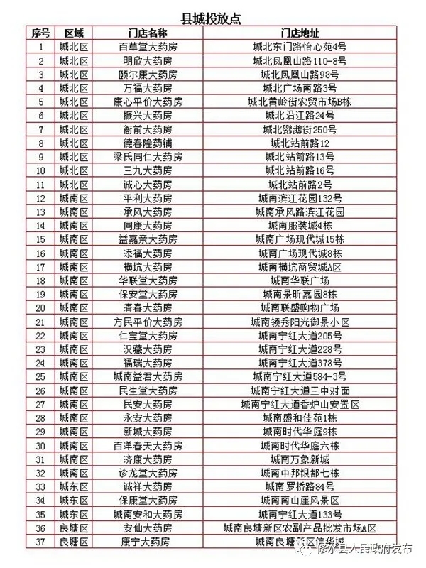 为进一步做好我县疫情防控工作,满足全县广大居民购买口罩需求,我县自2月24日起,启动网上预约购买口罩服务,首批投放8万个,以零差价的方式投放到江西九隆药品连锁有限公司旗下82个药店和部分乡镇政府设置的投放点(后附详细名单),每个投放价格为1元,每个预约成功的身份证一次限购5个,每个身份证每两天可预约一次。每预约成功一人,则投放点库存电脑系统数量自动减少5个,当库存数量为零时则不能再预约。以后将根据实际情况再进行投放,广大居民可持续关注“修水县人民政府发布”微信公众号发布的信息,不抢购,不囤积。 一、申请对象:修水县居民 二、申请方式:本次网上申购分为城区申购和乡镇申购两种方式进行,具体如下。 1、城区申购:县城城区居民须凭身份证和手机号码,通过微信或浏览器扫描“城区申购”二维码或关注“修水县人民政府发布”微信公众号,点击“申购口罩”菜单栏中“城区申购”链接,详细填写个人信息后进行网上预约申购。 2、乡镇申购:各乡镇居民须凭身份证和手机号码,通过微信或浏览器扫描“乡镇申购”二维码或关注“修水县人民政府发布”微信公众号,点击“申购口罩”菜单栏中“乡镇申购”链接,详细填写个人信息后进行网上预约申购。 三、预约时间:2月24日下午2:30到晚上9时。 四、购买方式及地点:预约成功者须凭预约人身份证,在指定的购买时间段内到本人预约成功的药店或部分乡镇政府设置的投放点错峰购买,超时未购买的将取消本次购买资格。 五、购买时间:2月25日、26日,每天上午8点半至下午5点半。