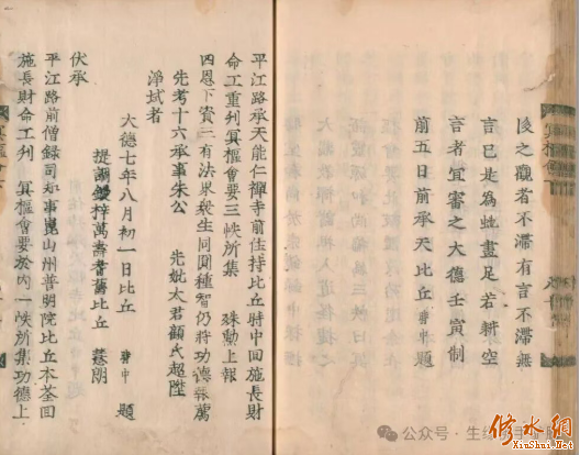 ![]() 译意:晦堂和尚从《宗镜录》中选取了大藏经、禅宗诸祖入道的捷径之语,灵源和尚将其编为三册,命名为《冥枢要集》。然而,这些版本的刻板已经湮没已久,难以寻觅。我在僧众中生活了五十年,一直想要阅读全本却无法得到。直到大德辛丑(1301年)冬天,我终于在福州隆藏主处找到一个版本,并进行了详细对照,发现毫无错误。于是,我决定重新刊印,使其成为不朽的传承。后世的读者在阅读时,不应执着于文字,也不应执着于无文字。这已经是画蛇添足之举,如果再空谈理论,就更应该谨慎了。 元朝大德壬寅年(1302年)制前五日承天寺比丘时中题 |