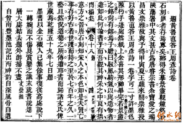 唐德宗贞元年间(785—805),从江西武宁县划出八个乡,设立分宁县,北宋沿袭,即今修水。张望(1736一1806)就是武宁人,字棕坛,号闰榻,故其文集以“闰榻”为名,《闰榻先生集》。在古文方面颇有造诣,在当时颇有声望,虽未科举入仕途,但得到嘉庆、道光年间帝师修水籍进士万承风、云南巡抚进士谭尚忠、云南布政使进士费淳等人的赏识,名隆一时。 本文来自修水网 张望《闰榻先生集》有《题黄鲁直答王周彦诗卷》,其文如下: 石刻真者存焉寡矣。乡得朱摹《景灵观钟铭》于陕藩署中,其文甚古,为唐睿宗书,余宝爱之。瑞昌文崇雅故与予得。甲寅夏,王鼎来问,崇雅授以黄鲁直《答王周彦诗》一卷,字可二寸许,墨色陈朽,手迹宛然纸上。余喜其形神毕完,若景灵之铭,尚有镕焉。 子瞻曰:驭风骑气,以与造物者游。如此何论书乎?而吾观其神采之中,良有拙意。方之晋、唐石刻,知宋人之本色如是。 夫贤亡事存,好古者世护而持之,至于七百年之久。一艺且然,况道德之所传遗耶?书而归诸文氏,俾世藏焉。 乾隆五十九年七月题。 ![]()