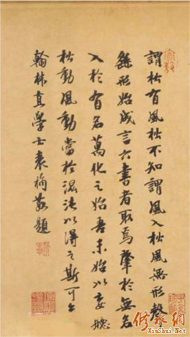 (2)袁桷重金收藏 上述柯敬仲跋中提及的收藏者“袁清容学士”指的是元代的袁桷。 袁桷(1266-1327),字伯长,号清容居士,庆元路鄞县(今浙江宁波)人。工书法,存世书迹有《跋黄庭坚松风阁诗帖》等。袁桷博古知今,在鉴定方面有很高的造诣,他对黄文节公答王周彦诗卷极为宝爱,不惜重价收之。其著作有《易说》《春秋说》《延祐四明志》《清容居士集》等。他历经元世祖、成宗、武宗、仁宗、英宗等朝,在英宗至治元年(1321)官至翰林侍讲学士,是元代重要的学者、文学家、史学家,也是当时著名的书画鉴藏家,与柯敬仲、杨载等文人多有交往,分别为袁清容珍藏的答王周彦卷题跋。 ![]() 谓松有风,松不知。谓风入松,风无形,声繇形始成。言六书者取焉。肇于无名,入于有名,万化之始。吾未始以妄听。松动?风动?当于混沌以得之,斯可矣。翰林直学士袁桷敬题。 (3)杨载(1271-1323),元代著名诗人、文学家,“元诗四大家”之一(其余三家为虞集、范梈、揭傒斯),籍贯为浦城(今福建南平浦城县),擅长诗文创作,亦通晓书画鉴赏,在元代文坛占有重要地位。杨载亦为《答王周彦》诗卷题跋。 黄文节公答王周彦诗卷,笔法妙绝,气韵飞动,优入神品,乃卷法书第一。此亦稀世之宝,岂易得哉?袁清容学士博古知今,鉴定真迹,尤为宝爱,不惜重价收之。且山谷尝用澄心堂帋,惟此卷用粉笺及李廷珪之墨,谓之三绝,于此阅之,岂非幸欤? 浦城杨载跋。 杨载跋云:黄文节公(黄庭坚)《答王周彦》诗卷,笔法精妙到了极点,气韵灵动飞扬,堪称进入“神品”级别,可算是他书法作品中的第一佳作。这卷作品也是世间罕见的珍宝,哪里是轻易能见到的呢?袁清容学士(袁桷)通晓古今、博识古物,擅长鉴别书画真伪,对这卷作品格外珍视,不惜花费高价将它收藏起来。况且山谷老人(黄庭坚)平日常使用澄心堂纸(宋代名纸),而唯独这卷诗卷用了粉笺(一种质地细腻、涂有粉层的名贵纸张),还搭配了李廷珪墨(唐代名墨,被誉为“天下第一墨”)——纸、墨、书这三者可称“三绝”,如今能在这里观赏到它,难道不是一件幸运的事吗? 周湖岭 (4)袁珙题跋: 家藏古人翰札,自南晋锺、王后,法帖并唐如栁公权辈者,法书数卷。惟宋黄山谷卷自有夺天工之妙,观之得趣处,精神已为其(阙)焉,而不(阙)者。 柳庄自跋。 题跋中自称“柳庄”的人是元末明初著名相术家、收藏家袁珙(1335—1410)。袁珙字廷玉,号柳庄居士,浙江鄞县(今宁波)人,以相术闻名朝野,曾为明成祖朱棣相面并预言其将登帝位,被后世誉为“神机妙算”的奇人。袁珙晚年隐居宁波城西“柳庄”,雅好收藏书画,构建了以“瞻衮堂”为核心的收藏体系。其藏品包括北宋王居正《纺车图》(现藏故宫博物院)、元代罗稚川《古树春溪图》等稀世名迹。据《式古堂书画汇考》记载,他还曾收藏黄庭坚《诸上座帖卷》《梵志诗卷》等书法珍品。 柳庄自题跋语:家中收藏有古人的书信手札,从东晋的钟繇、王羲之之后的法帖,到唐代像柳公权这类书法家的作品,共有好几卷书法真迹。其中唯独宋代黄庭坚的书卷,自有一种巧夺天工的精妙;观赏这幅作品领会到其中意趣时,精神已经被它(此处文字残缺,推测为“吸引”“打动”之类表意,指精神被书法所牵引),而没有(此处文字残缺,推测为“倦怠”“分心”之类表意,指精神专注而不分神)的感觉。 本文来自修水网 袁桷、袁珙两人均为宁波西门袁氏后裔,地缘与血缘关联为黄庭坚诗卷在元代至元末明初的私人收藏传承提供了潜在脉络。 在元代至元末明初的流传脉络中,《珊瑚纲》将袁珙题跋编排于柯敬仲、杨载为《此君轩诗》卷所作题跋之后,但袁珙题跋仅提及“家藏古人翰札……惟宋黄山谷卷自有夺天工之妙”,未明确此“宋黄山谷卷”具体所指为《此君轩诗》卷。据记载,袁珙(号柳庄)雅好收藏黄庭坚书法珍品,除题跋中未指明的“宋黄山谷卷”外,还曾收藏黄庭坚《诸上座帖卷》《梵志诗卷》等作品,因此无法仅凭《珊瑚纲》的编排顺序及袁珙题跋内容,直接认定其题跋关联的“黄山谷卷”即《此君轩诗》卷。 (六)王世贞收藏、周天球双钩入石 明代江苏省太仓人王世贞曾收藏《此君轩诗卷》并请人双钩入石。 王世贞(1526—1590),字元美,号凤洲,又号弇州山人,明代中后期杰出的文学家、史学家,亦是当时颇具影响力的书画鉴藏家。 嘉靖二十六年(1547),王世贞考中进士,自此踏入仕途:初任大理寺左寺、刑部员外郎及郎中,后外放历任山东按察副使兼青州兵备使、浙江左参政、山西按察使;万历年间,又先后任职湖广按察使、广西右布政使、郧阳巡抚。因与张居正政见不合遭排挤,他曾罢官归返故里;张居正去世后,王世贞得以起复,历任应天府尹、南京兵部侍郎,最终累官至南京刑部尚书,逝世后获赠太子少保,世称“王弇州”。 周湖岭 在文化领域,王世贞地位显赫,独领明代中后期文坛风骚二十年,是“后七子”流派的核心人物之一。其著述宏富,涵盖文学、史学、艺术评论等多个领域,代表作包括《弇州山人四部稿》《弇山堂别集》《嘉靖以来首辅传》《艺苑卮言》《觚不觚录》等 。 王世贞《弇州山人四部稿》有《山谷老人此君轩诗》跋文 原文: 先骑曹子猷云:“何可一日无此君?” 吾家小祗园竹万箇,中有轩三楹,不施丹垩,纯碧而已。零雨微颸、朝暾夜月,峭蒨青葱,映带眉睫间,令人神爽。陈子兼方伯为题署曰 “此君轩