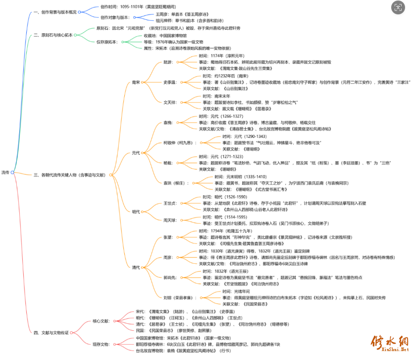周湖岭 道光庚寅年(1830),周彦得到此诗卷,一直珍藏着不轻易展示给他人。过了三年,也就是道光壬辰年(1832),周彦特意带着诗卷向郭尚先(字兰石,清代著名书画家、鉴赏家)请教鉴定。郭尚先认为这是现存黄庭坚书法作品中最为完好精良的一件,我因此将这幅诗卷的流传脉络与相关背景记述于此。 (八)郭尚先题跋(1785—1832),字符开,号兰石,福建莆田人。嘉庆十四年(1809)进士,历任乡试考官、国史馆纂修、文渊阁校理、四川学政、左赞善、光禄寺卿等职。道光十二年(1832)春,他获诏授大理寺卿、礼部右侍郎,专职负责学政与官吏考核事务。郭尚先学识广博,艺能全面。书法:初学欧阳询,后兼学颜真卿、褚遂良,风格自成一派,当时朝鲜、日本人士争相以重金求购其墨宝。绘画:擅长山水画,尤其精通兰石题材创作,笔墨功底深厚。篆刻:作品古朴浑厚,法度严谨,被评价为“深入汉人之室”,尽显汉印精髓。学术著述颇丰,除《芳坚馆印存》二卷已刊行传世外,还留有《进奉文》《经筵讲义》《增默庵文集》《增默庵诗集》《芳坚馆题跋》《使蜀日记》等多部作品,涵盖文、诗、题跋、日记等多个领域。 郭尚先的黄山谷《此君轩》诗题跋原文: 本文来自修水网 建中靖国元年正月辛未,钟陵黄庭坚鲁直《奉答周彦山谷此君轩诗》。 山谷此君轩诗,数年前见一石本草书者,真有孤蓬自振、惊沙坐飞之势,中年得意书也。此卷悬捥回锋,以篆籕法作书,圆劲生动,墨色微脱,弥见古雅。平生所见黄书,未有如此之完善者。涧东仁兄好古博雅,而名适与王庠之字同。山谷有灵,当喜此卷得所归,而谓八百年前能先知也。道光壬辰(1832)大暑日,久旱得雨,展观志快,因题。 莆田郭尚先。(印章) 郭尚先黄山谷《此君轩》诗题跋云: 关于黄庭坚这首《此君轩》诗的书法作品,几年前我曾见过一件石刻拓本,是用草书书写的,笔势真有“孤蓬自振、惊沙坐飞”的豪迈气势,这应当是他中年书法技艺成熟、创作得意时期的作品。而眼前这幅诗卷,书写时手腕高悬、笔锋回转,用篆书与籀书(先秦古文字字体)的笔法来创作行书,字体圆润遒劲又灵动鲜活,墨色虽有轻微脱落,反而更显古朴雅致的韵味。我这辈子见过的黄庭坚书法作品,从未有像这幅这样完美的。 涧东仁兄(“涧东”是周彦的号)喜爱古物、学识渊博且品行高雅,况且他的名“周彦”,恰巧与宋代荣州(今四川荣县)名士王庠的字(王庠字周彦)相同。若黄庭坚在天有灵,应当会为这幅诗卷找到合适的归宿而感到欣喜,还会感叹:仿佛八百年前就能预知今日之事。 周湖岭 清道光壬辰年(1832)大暑这天,久旱之后恰逢降雨,我展开这幅诗卷观赏,心中畅快,于是写下了这篇题跋。 郭尚先为清代著名书画家、大理寺卿,其“未有如此之完善者”的鉴定结论,为周彦刻碑传播提供权威依据,周彦因“名与王周彦同”对诗卷有特殊情感,故推动刻碑以延续流传。 周彦于1830年(道光庚寅)得《寄王周彦此君轩》诗卷,1832年(道光壬辰)大暑日请郭尚先(1785—1832)鉴定;郭尚先题跋称此卷为“山谷书最完善者”,并记录其“悬捥回锋、篆籕法”笔法特点。因郭尚先卒于1832年,该题跋为其晚年作品,题跋后不久即去世,并未参与后续刻碑事宜。周彦在郭尚先去世后,才将诗卷双钩上石,刻碑于鄱阳荐福寺碑林。 乾隆五十九年(1794)七月,张望为《寄王周彦此君轩》诗卷题跋,彼时诗卷由瑞昌人文崇雅交付张望(据张望《题黄鲁直答王周彦诗卷》“瑞昌文崇雅故与予得…… 甲寅夏,王鼎来问,崇雅授以黄鲁直《答王周彦诗》一卷”);至道光庚寅年(1830),周彦得到此诗卷,两者相隔 36 年。1794—1830 年间,诗卷从张望题跋时的状态流转至周彦手中,具体流转路径与经手者未见于现存文献记载。 本文来自修水网 (九)孝廉刘镕白布朱拓 《民国荣县志》:“光绪中,县孝廉刘镕不知何所得,赠元师一诗,白布朱拓,字如松风阁诗,惜未钩摹上石,今难访寻矣。” 光绪年间,荣县孝廉刘镕不知从何处得到了黄庭坚赠祖元禅师的一首诗,是白布朱拓本,字迹如同黄庭坚的松风阁诗帖,但可惜没有钩摹上石,到民国时期已经很难访寻了。该拓本为黄庭坚赠祖元禅师诗的唯一白布朱拓记录,因未钩摹上石,故民国后失传,现存文献中仅《民国荣县志》有记载。 疏理以上分析: (一)流传示意图 ![]()