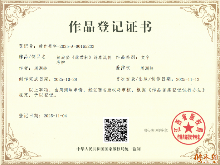 周湖岭 (三)史季温收藏(约1200—1270),字子威,号植斋,宋眉山青衣人,理宗绍定五年(1232)进士。史季温著有《山谷别集注》《山谷精华录》等。黄庭坚诗集在宋代分为《内集》《外集》《别集》三大系统。史季温继承祖父史容的《山谷外集注》,进一步注释《别集》中的76首诗,成《山谷别集注》二卷。此举填补了黄庭坚诗歌注释的空白,使“三家注”(任渊注《内集》、史容注《外集》、史季温注《别集》)成为后世研究黄诗的权威文本。 史季温《山谷别集注》注《答王周彦诗》: 墨迹今藏于前忠南刘守子晖家。元符二年自黔移戎留江安作。 记录了此诗书法作品收藏者身份与属地。“前忠南刘守”指曾任元代“忠南路”的刘姓官员,“守”是“知州”的古称(宋代以后地方行政长官的别称),“子晖”为其字号;“家藏”说明此墨迹在元代为私人收藏。“自黔”指从黔州(今重庆彭水)出发,“移戎”指调任戎州(今四川宜宾),“江安”是途中停留地(今四川江安,宋代为长江沿岸交通节点),“留作”即途经江安时临时创作。 本文来自修水网 元朝(1271年—1368年)。 “史季温的生活时代”与“对收藏者属地‘忠南路’的朝代界定”矛盾。史季温生卒年约为1200—1270年,属于南宋(1127—1279)。他的核心著作《山谷别集注》是南宋时期完成的,其注释内容应基于南宋及此前(如北宋)的历史语境,不可能涉及南宋灭亡后才出现的行政区划名称。“前忠南刘守”时,称“忠南路”是元代行政区划(元朝1271年建立,1279年灭南宋)。但“忠南路”作为元代四川行省下设的行政单位,是元朝建立后(1271年起)才设立的,南宋时期根本不存在这一地名(南宋时该区域属夔州路等旧有区划)。南宋人史季温(1270年去世),不可能在其注释中使用“元代忠南路”这一“未来”的行政区划名称来描述收藏者属地。推测矛盾源于“后世对史季温注释的解读误差”,或南宋文献在元代传抄过程中,可能存在抄手用元代地名替换南宋旧称的情况,而非史季温原文本身。 史季温在《山谷别集注》中记载收藏者时,可能使用的是南宋时期的地名(如“夔州路某州”),但后世(元代及以后)解读时,习惯用“当代地名”(即元代的“忠南路”)替换旧称,导致出现“南宋人用元代地名”的错位; 修水网 www.xiushui.Net 总之,这段内容的矛盾是“史季温的南宋时代”与“‘忠南路’的元代行政区划属性”无法兼容。 (四)文天祥跋(1236-1283),文天祥是江西吉安庐陵县人。宋理宗宝祐四年(1256)状元,是南宋末年的政治家、文学家,也被尊为民族英雄,和陆秀夫、张世杰一起被称为“宋末三杰”。 明代汪砢玉《珊瑚纲》文天祥题跋原文: 山谷道人题荣州祖无大师元上人诗,如炉铸铁,而笔力遒劲,字势飞扬,猊虎斗争,龙蛇变化,莫测去来之迹。是殆日月星辰彰于天,山川草木形于地,而不知孰使之然也。诗句字画,称唐之盛也:诗如李、杜,书如颜、柳,无加矣。至宋元祐、熙丰间,乃有道人者出,不惟可以追驾古人,遂至兼取众长,集之一己。近臣诸公,诗句如村店酒望,字画如妓馆歌儿,而去古人益远矣。吾于是卷,盖三叹云。 吉州文天祥。 清代王士祯《居易录》:吉州文山文天祥跋:“书不必工,有岁寒松栢之气。” ![]()
