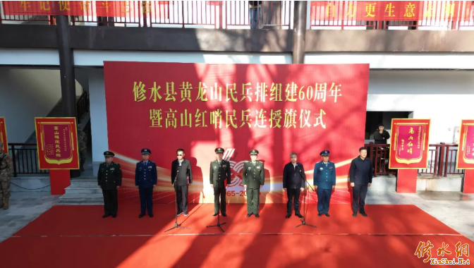 今天上午,修水县黄龙山民兵排组建60周年暨高山红哨民兵连授旗仪式举行。市委常委、九江军分区司令员丁庆顺为民兵连授旗。九江军分区政治委员袁俊锋宣读民兵连组建命令。市政府副市长、市公安局局长熊小青致词。县委书记郑庆华主持授旗仪式。九江军分区政治工作处主任余泳,县领导曾新华、束伟、朱杰出席。