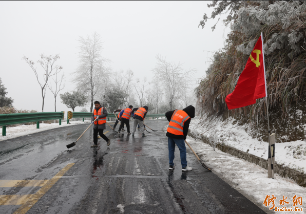 连日来,受强冷空气影响,修水县国道G353线白岭镇南楼岭路段和黄港镇茅竹山路段气温骤降,路面快速积雪结冰,严重影响群众出行安全。九江市公路发展中心修水分中心闻雪而动,第一时间启动应急预案,组织党员骨干与养护人员奔赴一线,打响抗冰除雪保通攻坚战。